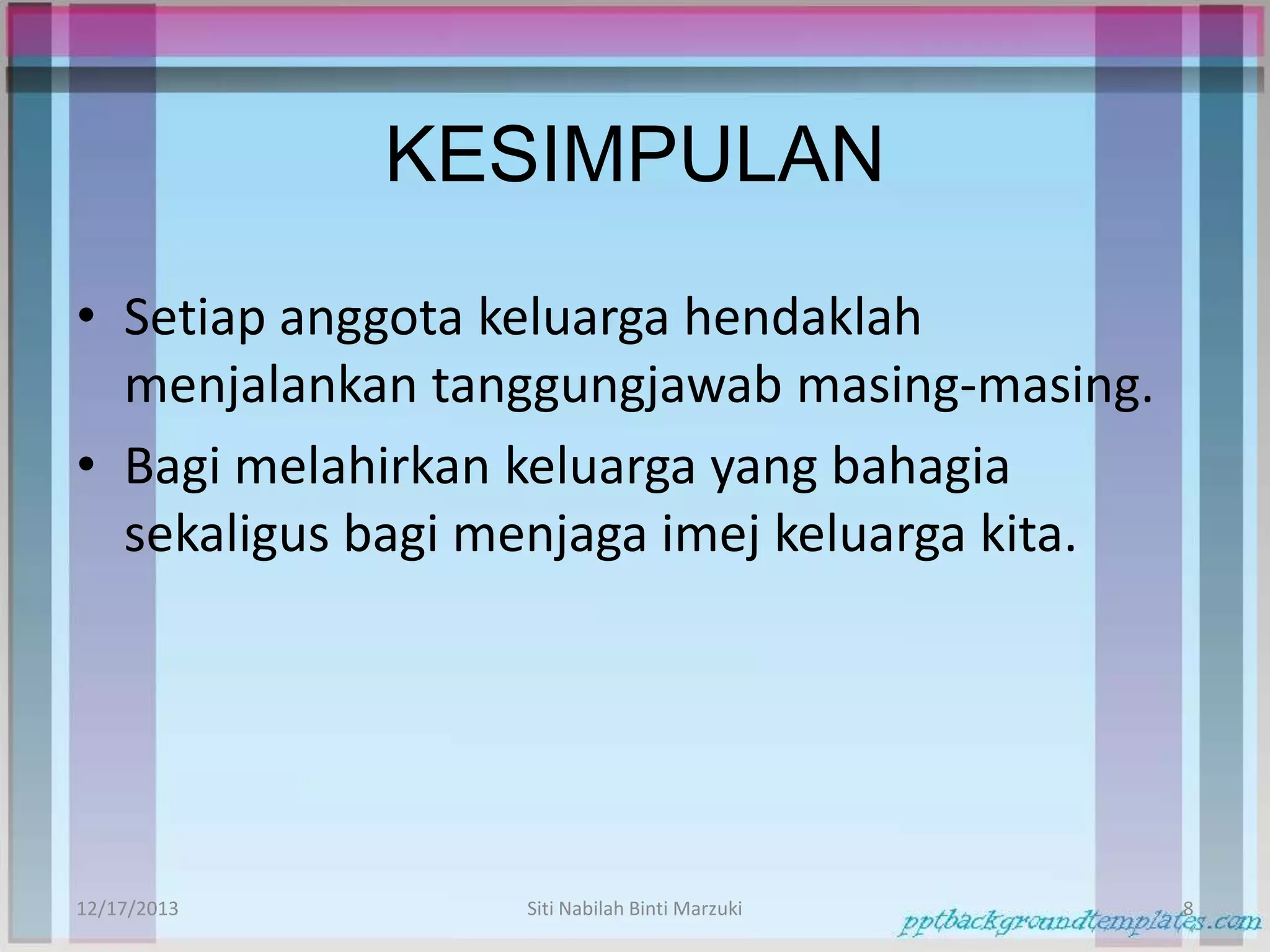 Kesimpulan setiap anggota keluarga hendaklah. Cara melaksanakan tanggungjawab diri sebagai anggota keluarga. Dalam unit ini saya belajar tentang tanggungjawab diri saya sebagai anggota keluarga.